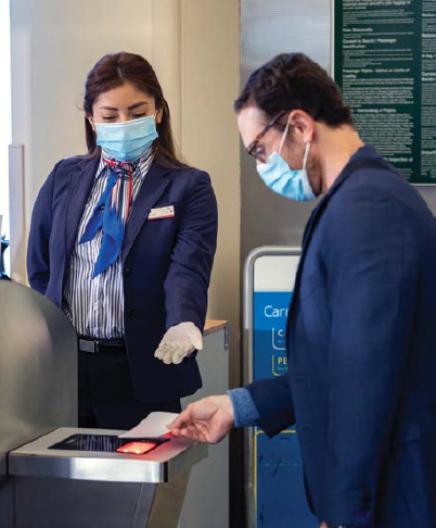 También está usando postes distanciadores para generar separación en las puertas de embarque. Los carteles digitales y una mayor cantidad de anuncios en la puerta de embarque promueven prácticas de embarque más seguras que evitan la aglomeración. Además, los pasajeros pueden abordar usando tecnología sin contacto que les permite autoescanear sus tarjetas de embarque.