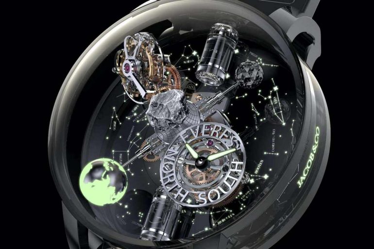 El Astronomia Tourbillon Everest presenta un tourbillon gravitacional de doble eje característico de Jacob & Co en uno de los cuatro satélites. Para destacar su conexión con la tierra, la cara está construida con cubos transparentes de agua real que Nilson tomó en los polos norte y sur. En el centro del reloj hay una pieza real de roca genuina del Everest.